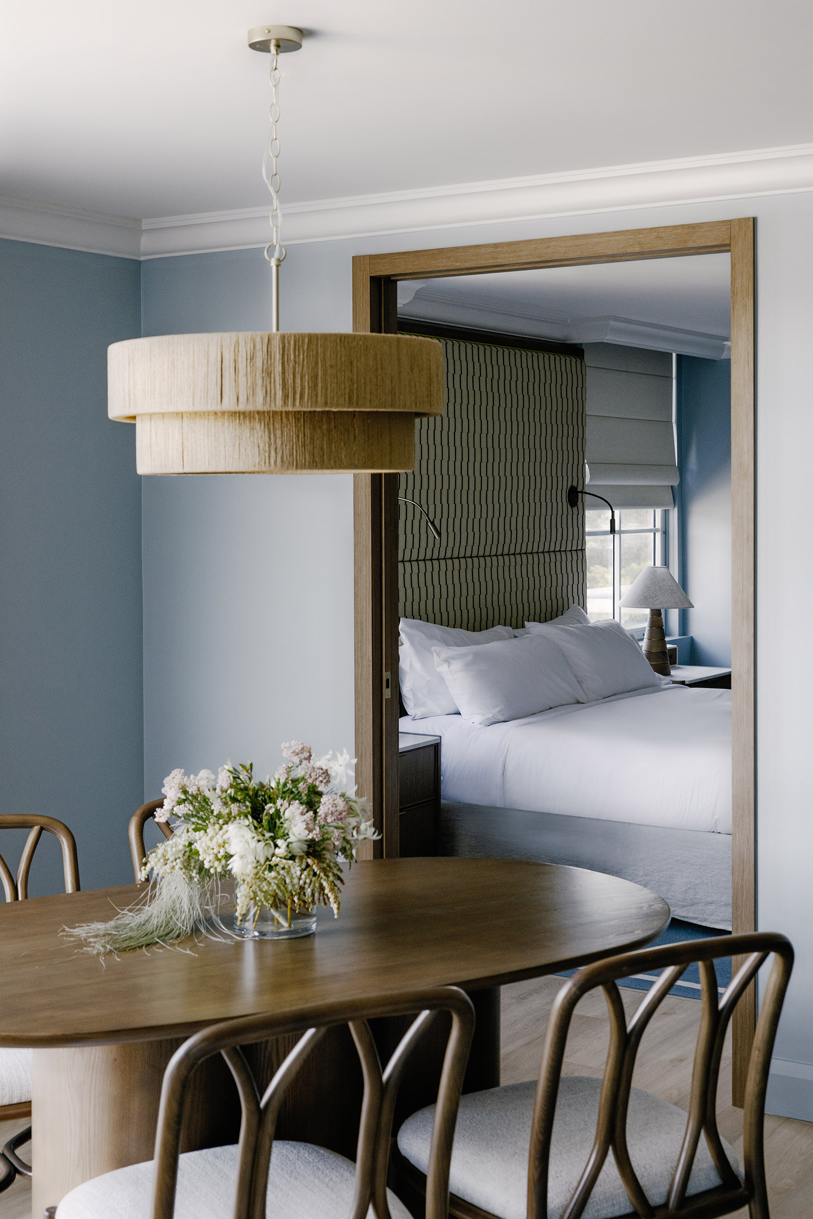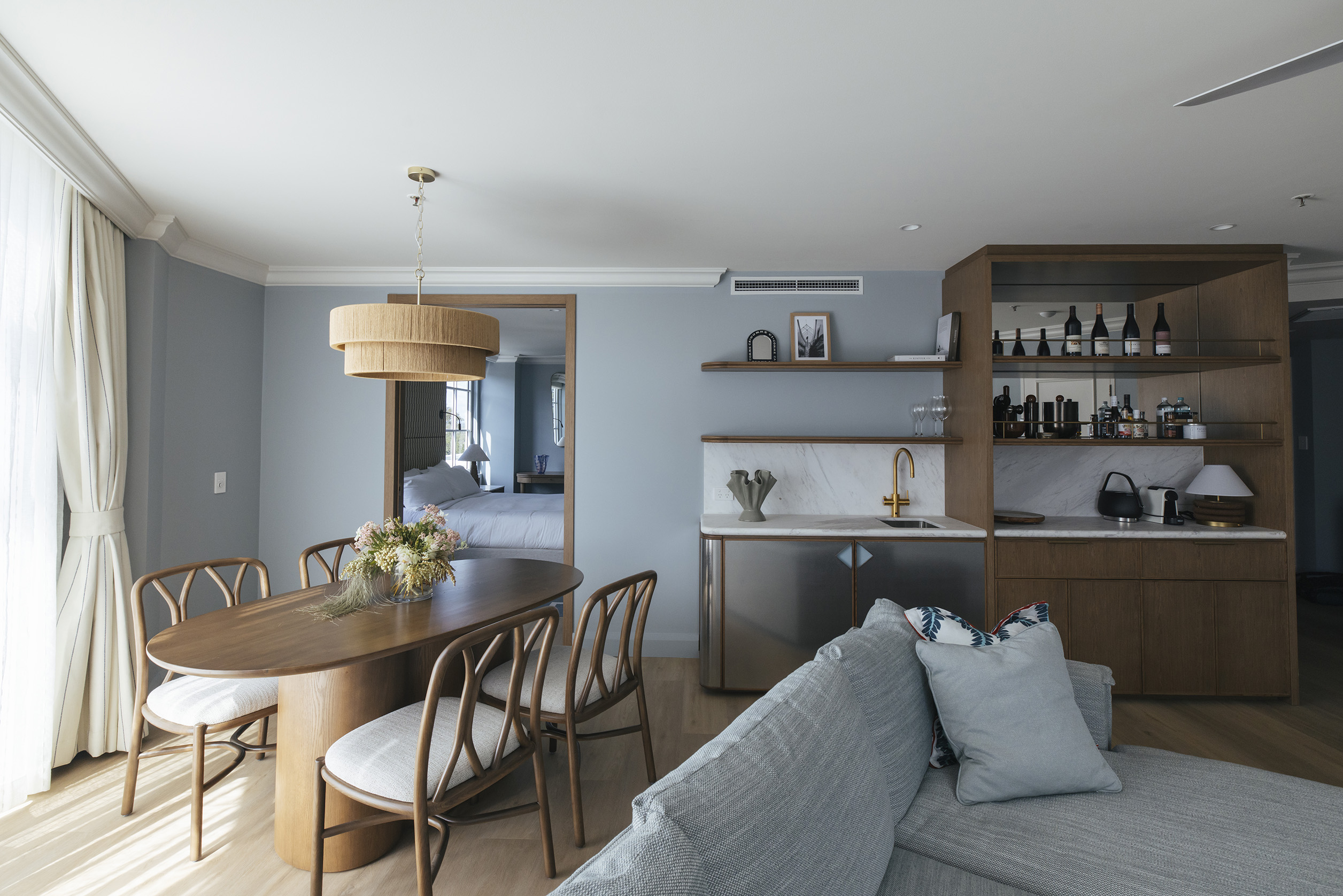 Designed by Mitchell & Eades, the suite unfolds with residential generosity: a separate bedroom anchored by a king bed, a dedicated living area for quiet retreat, and that seamless indoor-outdoor flow that defines the Noosa experience. The private balcony becomes more than a viewing platform – it’s a threshold to poolside ease, where a reserved cabana awaits for languid afternoons beneath dappled shade.