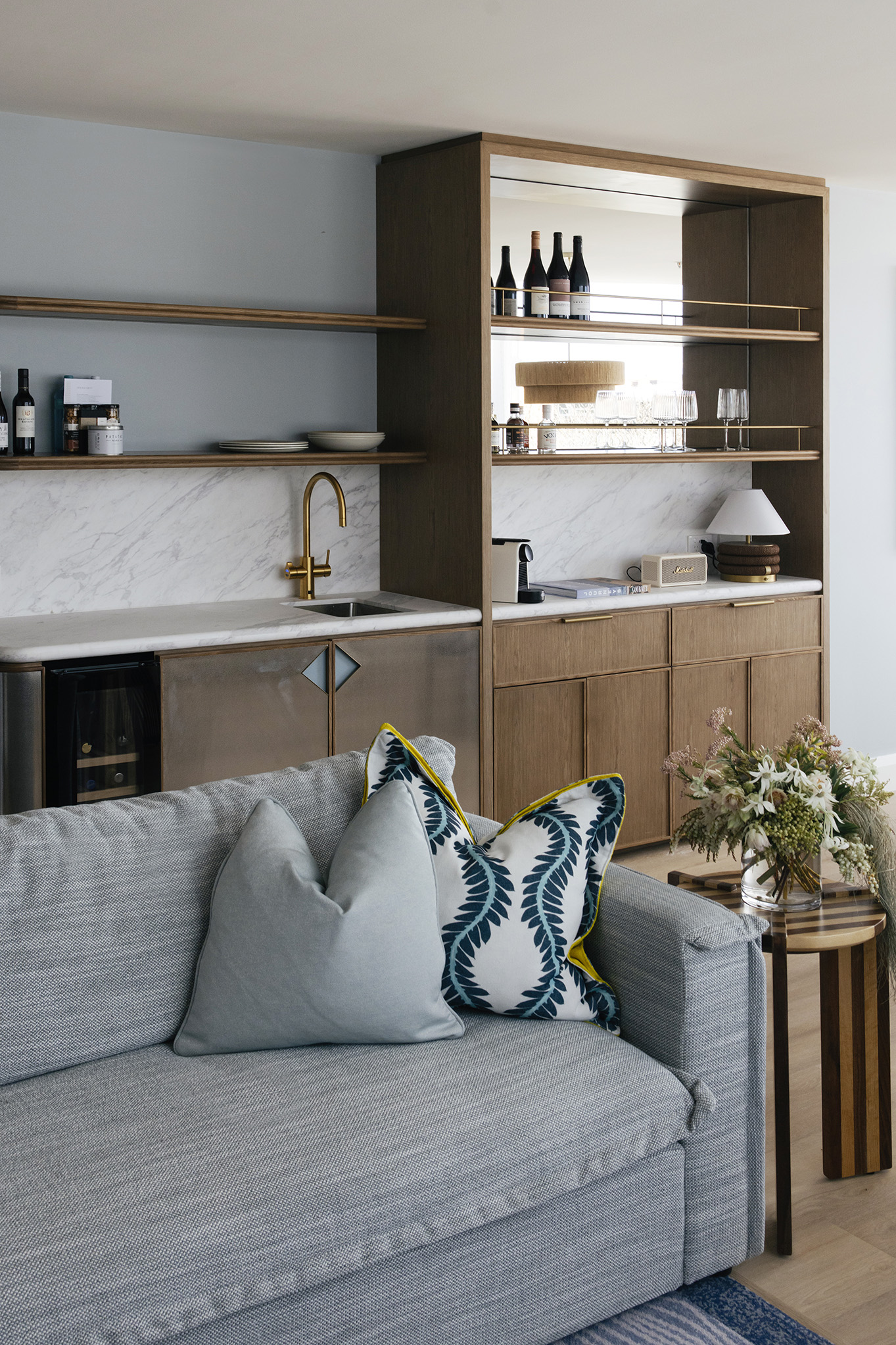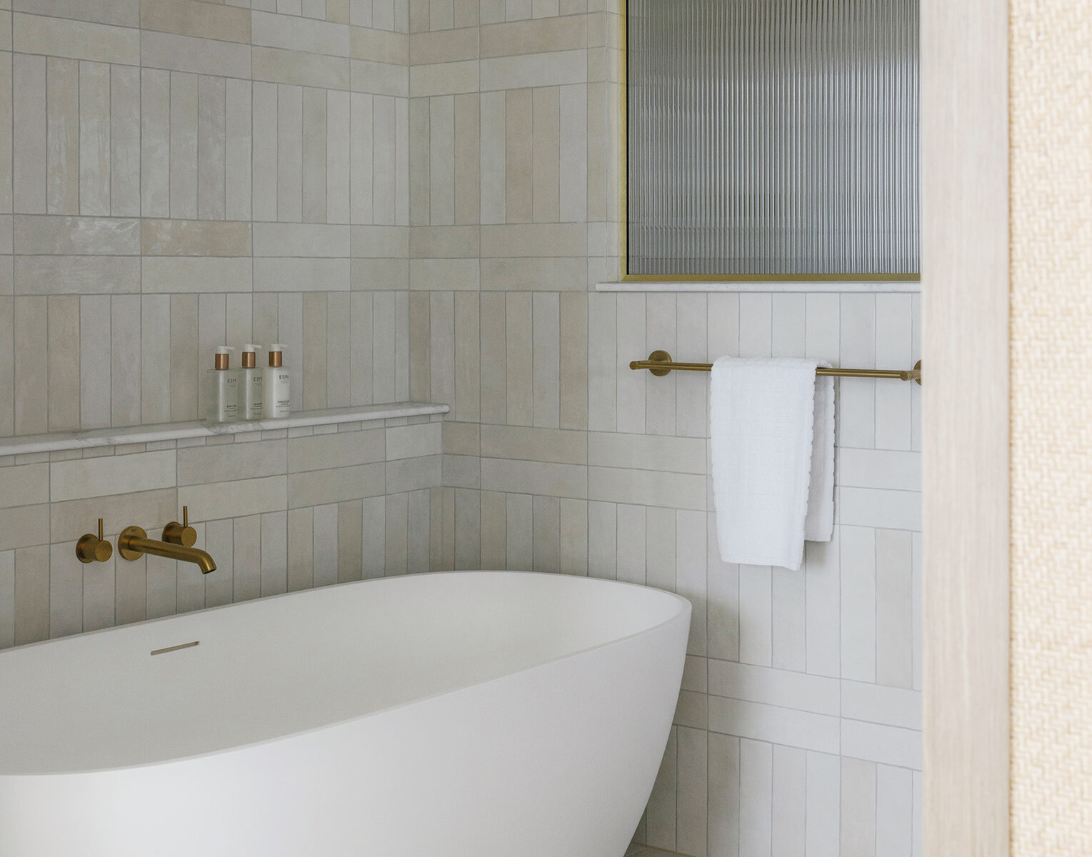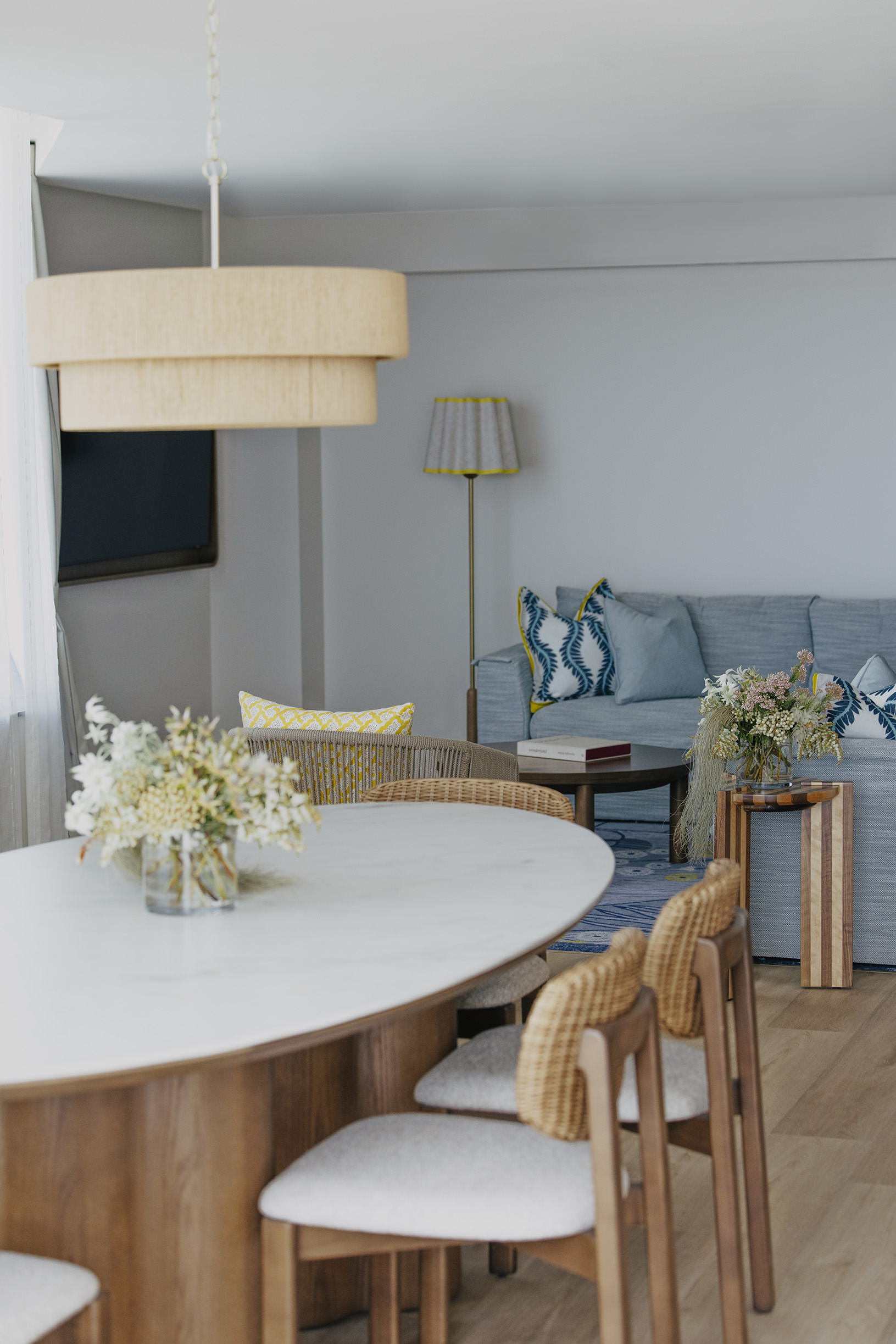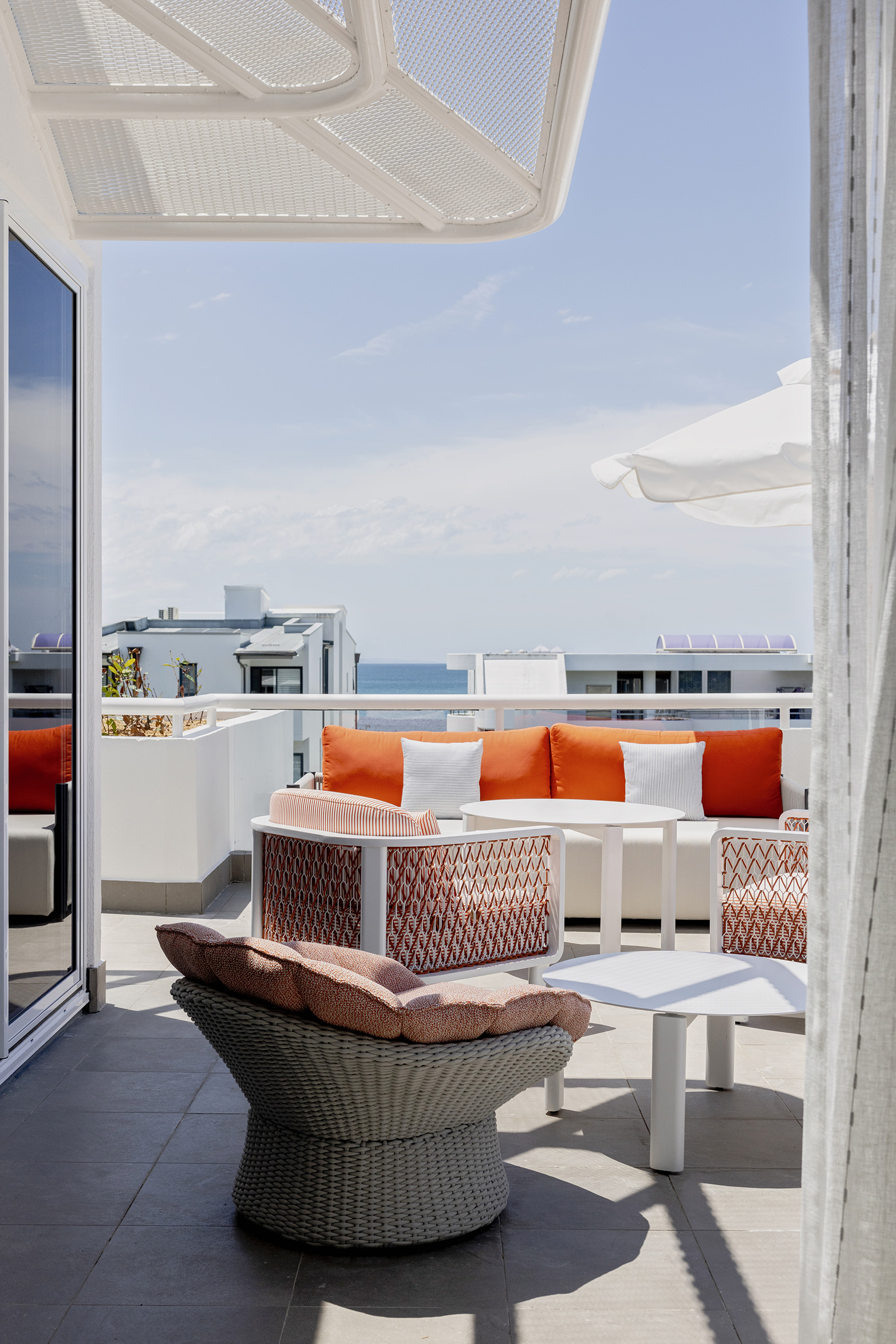 Designed by Mitchell & Eades, the suite unfolds with residential generosity: a separate sleeping sanctuary for true repose, a formal dining area, and a dedicated living space that flows with the flexibility modern travel demands. A large outdoor terrace serves as your alfresco lounge, where ocean views stretch to the horizon. The bathroom becomes its own sanctuary, anchored by a deep soaking tub that invites unhurried rituals and the simple luxury of time suspended.